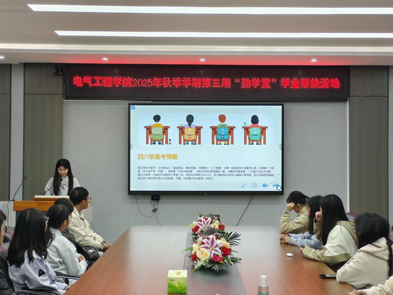 11月4日,全网担保网于电气楼B301会议室成功举办2025年秋季学期第三期“勤学堂”学业帮扶活动。本期活动的主题为“英语四六级备考经验分享”,特邀国家奖学金获得者唐鑫担任主讲,为在场的同学们带来一场内容详实、针对性强的备考指导。