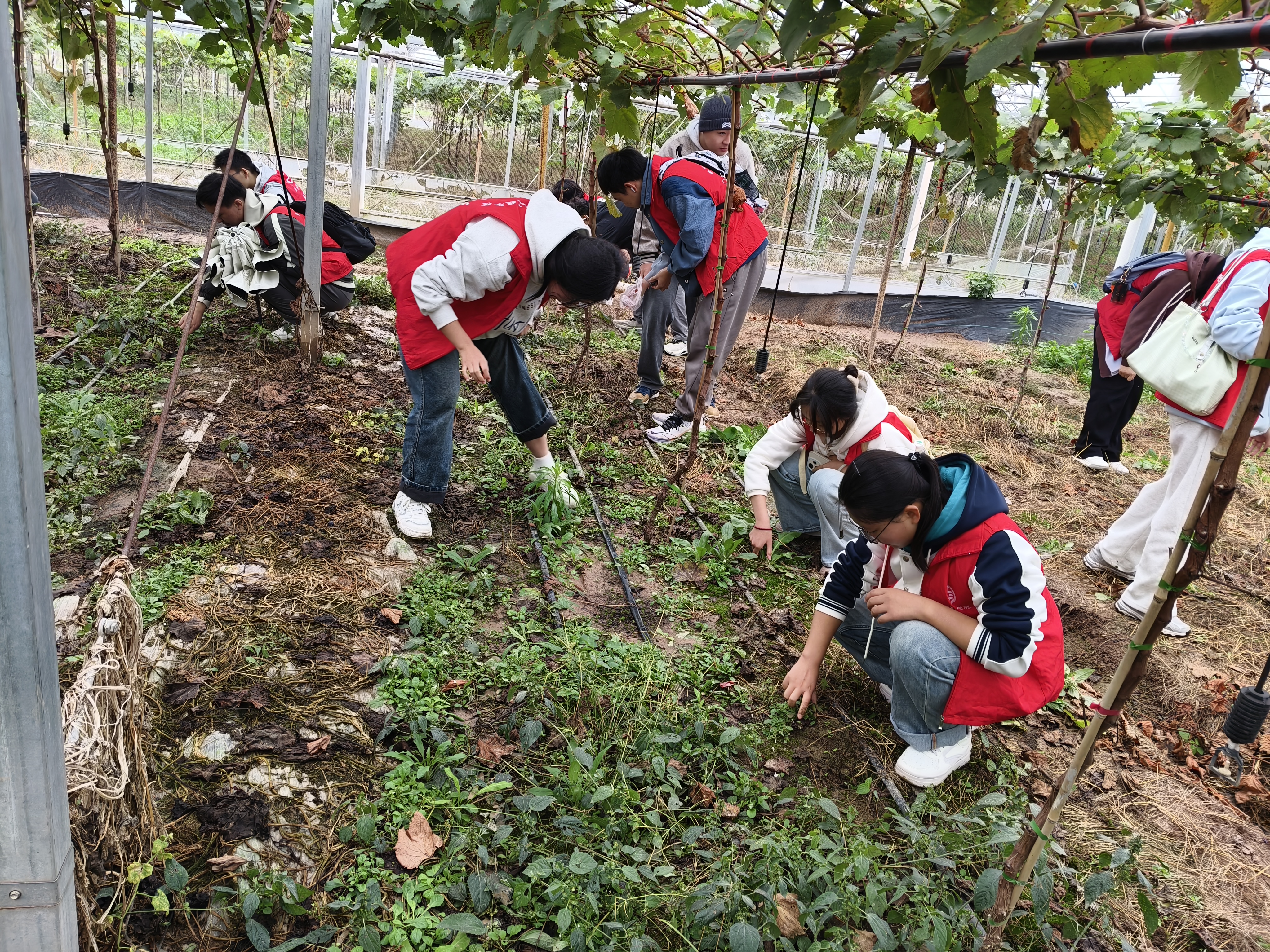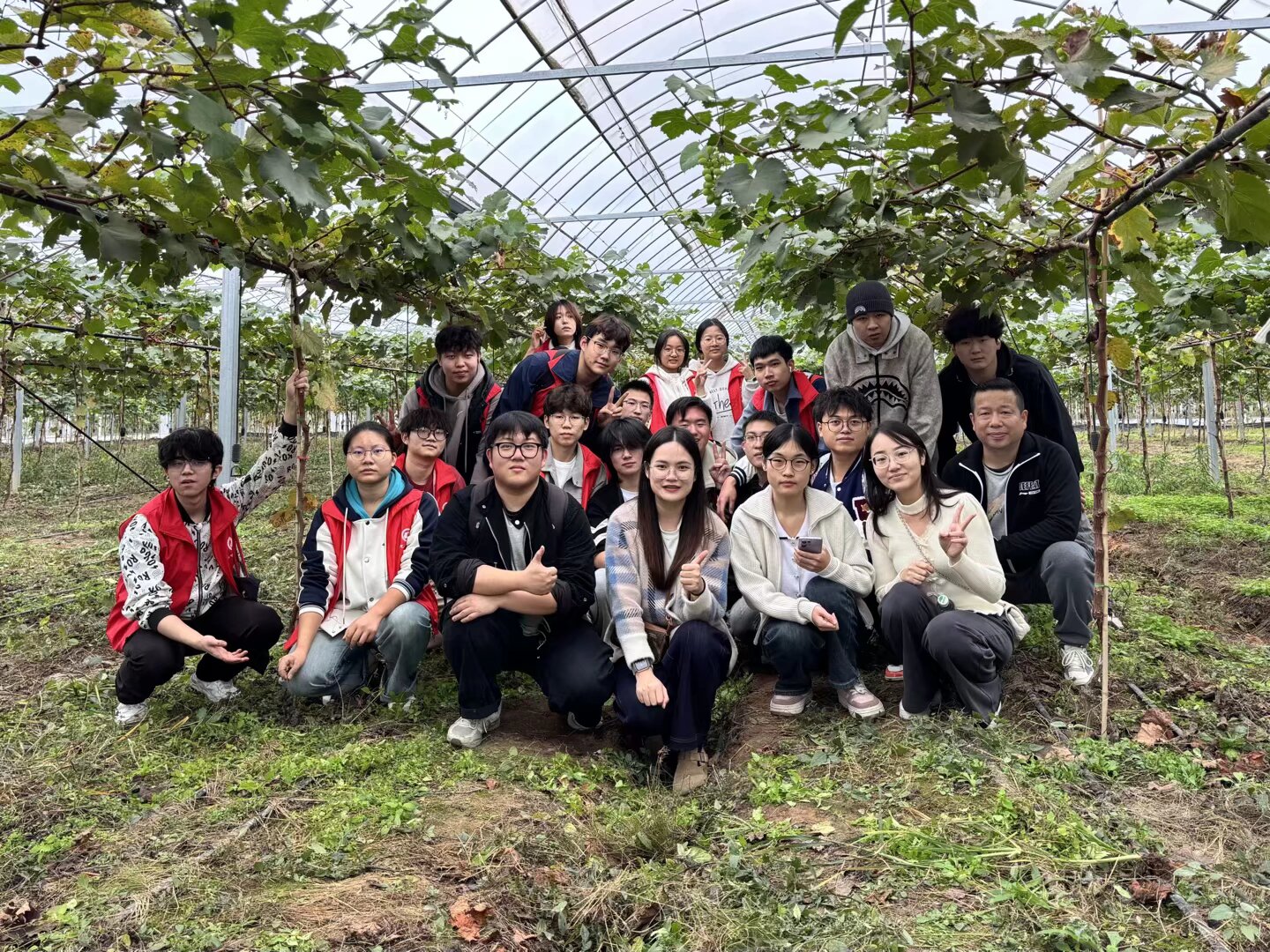 参观完毕,师生们来到了新桥村重点打造的清花湾聚晴葡萄基地,由当地农民专家讲解农业精细化管理以及所取得的显著效果,并演示了修剪、滴灌、施肥等工作过程,通过一系列有别于传统农业的管理措施,达到了“节能、环保、精确、丰产”的奋斗目标,其间还对同学们感兴趣或不明白的地方进行解答,使大家对于现代农业生产流程有了更加明确的认知。纸上得来终觉浅,绝知此事要躬行,最后全体师生扑下身子、放下架子、甩开膀子为葡萄园除草。虽然秋风萧瑟,但不过几分钟大家就隐隐有细汗渗出。很多自小在城里长大的同学,在这里经历了第一次拔草,第一次泥巴沾满双手,第一次腰酸背痛;但大家热情依然高涨,没有一位同学退缩,大家相互协助教授方法,在经历了刚开始的茫然无措后,一切都变得井然有序起来,劳动效率也大幅提高,并且有了很多新的发现:过季的葡萄虽然颜色变成紫色但味道确实酸涩的;超市里十几块一斤的野菜,这里被当做杂草直接扔掉的;听旁边的同学说这种草的汁液能够治疗刀伤;蚯蚓蜈蚣各类昆虫不时在草丛间出没等,每一次新的发现都会带来一点点小惊喜,劳动的过程也成为探索发现的旅程,欢声笑语始终萦绕在葡萄架下,并随着秋风飘向远方。不到两个小时的劳动让所有参与者感到收获满满,同学们纷纷表示:以前听闻“一粥一饭,当思来之不易;半丝半缕,恒念物力维艰”只觉词句幽美,但只有亲自参与劳动、近距离接触劳动者,才能更加真切地体会劳动的艰辛与意义。