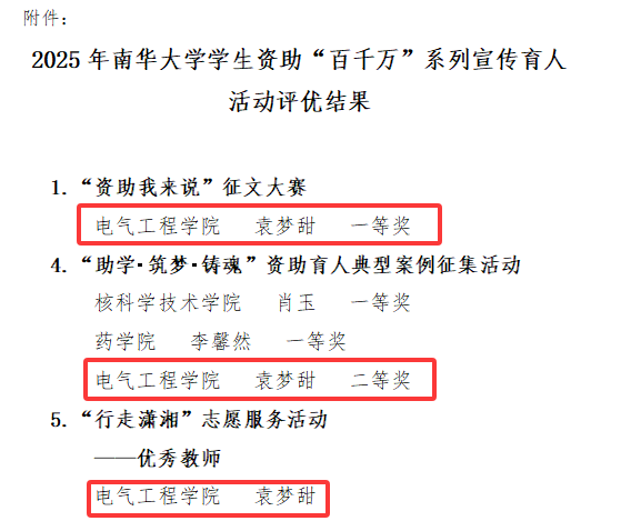 我院教师袁梦甜在此次活动中表现突出:荣获“资助我来说”征文大赛一等奖、“助学・筑梦・铸魂”资助育人典型案例二等奖,并在“行走潇湘”志愿服务中被评为“优秀教师”,集中体现了我院教师在立德树人、实践育人方面的示范引领作用。